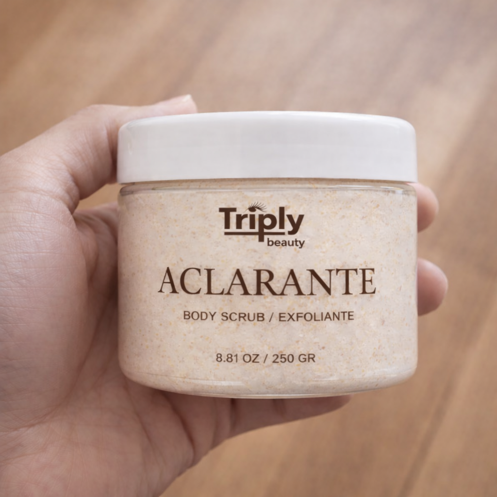 El Exfoliante Aclarante Corporal combina microgránulos naturales + activos aclarantes suaves en una sola fórmula.